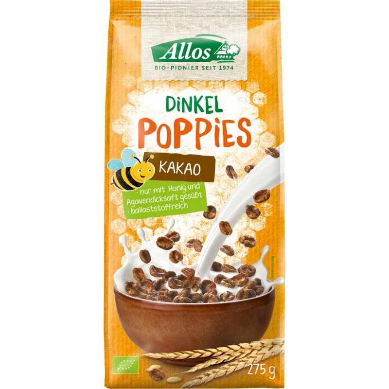 Unsere leckeren Dinkel Kakao Poppies bestehen aus 62% gepoppten Dinkelvollkornflocken und herbem Kakao. Sie sind nur mit Bienenhonig und Agavendicksaft gesüßt.