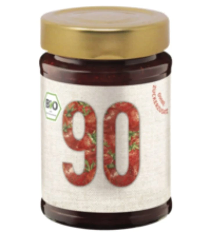 Sibani Fruchtaufstrich Erdbeere 90%. Der vegane Fruchtaufstrich mit Erdbeere hat einen Fruchtanteil von 90% und ist mit Erythritol gesüßt. Auf Brot, Brötchen, Croissant streichen oder einen Klecks davon in den Joghurt geben.