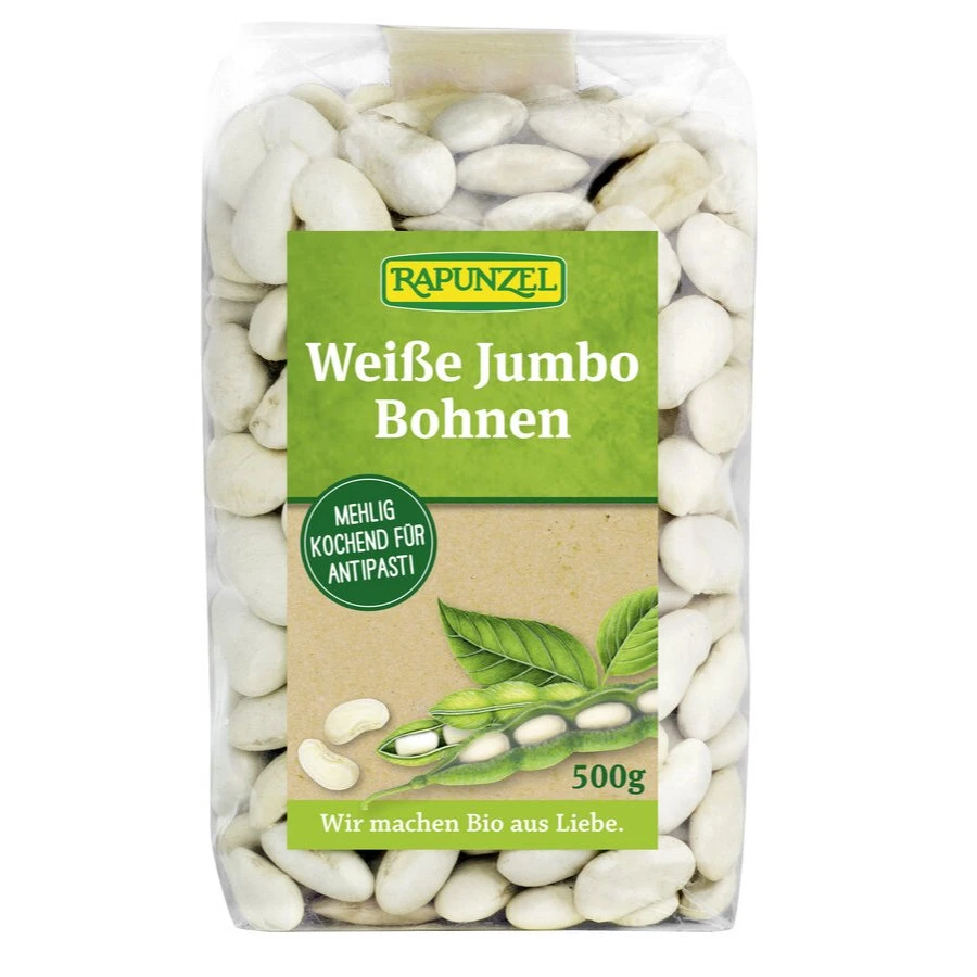 Bohnen waschen und 8 – 12 Stunden in reichlich kaltem Wasser einweichen. Danach Wasser abgießen und Bohnen abspülen. 1 Tasse Jumbo-Bohnen mit etwa 3 Tassen Wasser einmal aufkochen und dann ca. 60-90 Minuten bei geringer Temperatur und geschlossenem Deckel sanft köcheln lassen. Erst nach dem Kochen salzen.