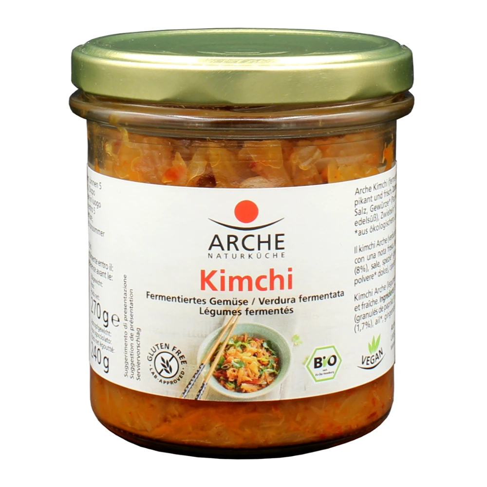 Arche Kimchi aus Weißkohl, Karotten, Zwiebeln und Gewürzen schmeckt würzig, pikant und säuerlich-frisch. Es ist eine vielfältige Beilage zu verschiedenen Gerichten, schmeckt in Suppen, Wraps oder Bowls.
