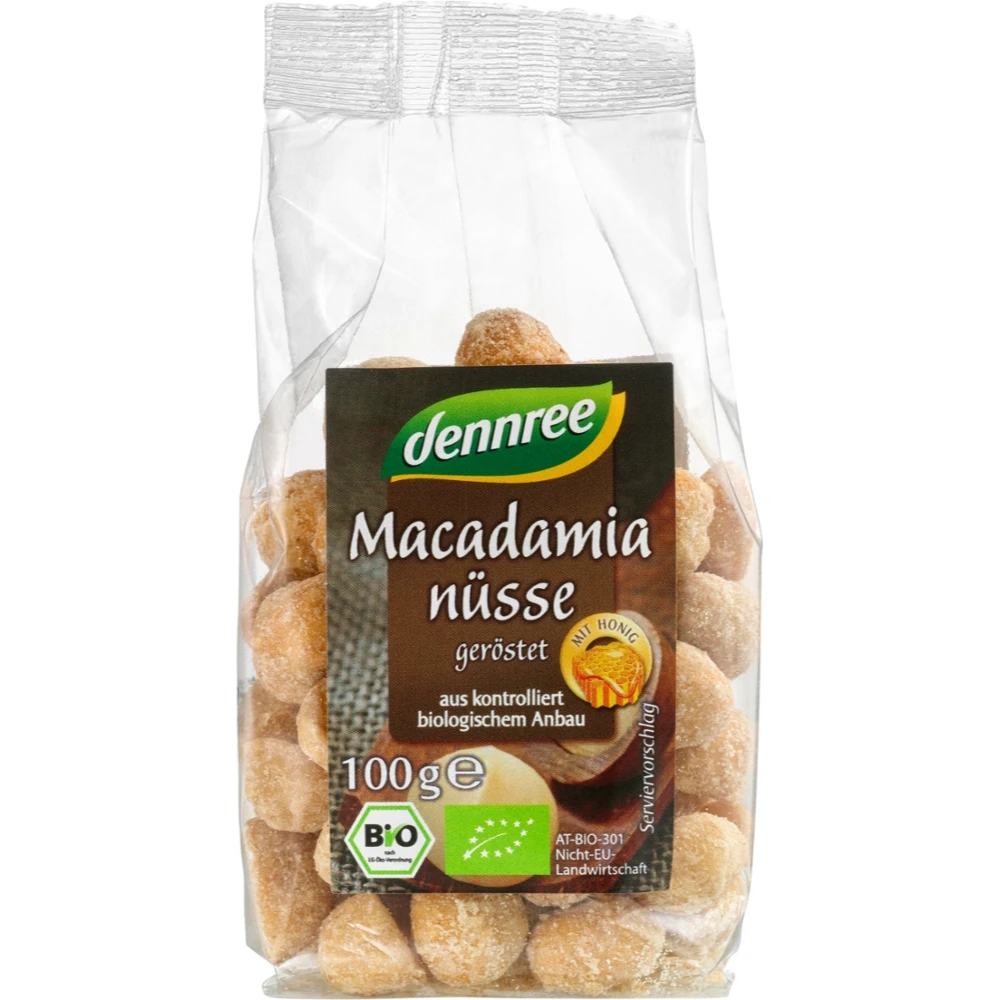 Bio-Macadamianüsse, geröstet, mit Honig bieten nussig-süßen Genuss.
