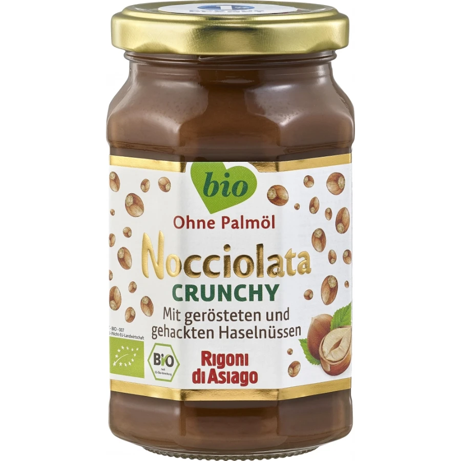Rigoni di Asiago Haselnuss-Nougat-Creme mit gerösteten und gehackten Haselnüssen. Als Brotaufstrich oder zum Füllen selbst gebackener Kekse, Kuchen, Torten oder Crêpes.