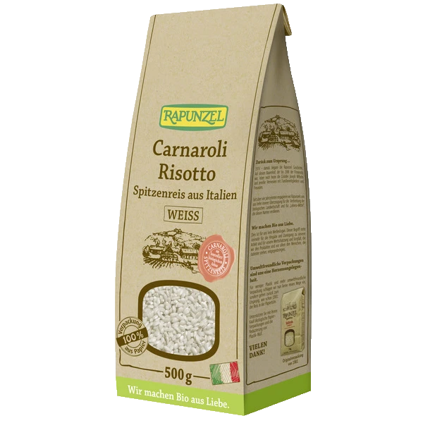 Der ideale Risotto-Reis für die gehobene Gourmetküche! Einzigartig cremig und voll aromatisch mit typischem ‚al dente‘ Biss. Der Carnaroli Reis stammt aus dem traditionellen Reisanbaugebiet Piemont. Er wächst in der nord-italienischen Po-Ebene, wo er in ökologischer Landwirtschaft mit viel Liebe und Erfahrung hergestellt wird.